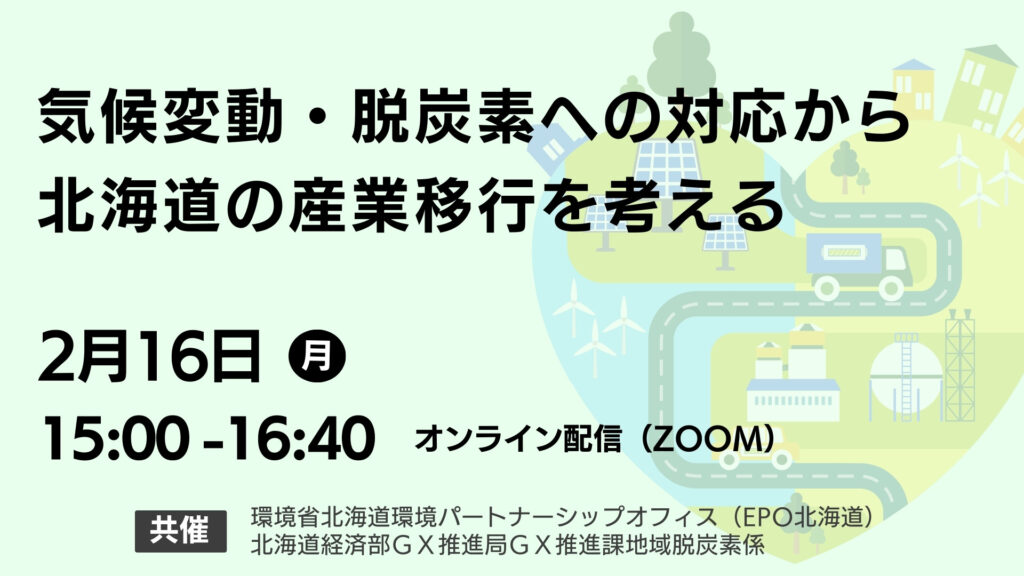 この会は2050年カーボンニュートラル達成に向けた「公正な移行」をテーマとしたオンライン企画シリーズの一環として、北海道経済部GX推進局GX推進課地域脱炭素係と環境省北海道環境パートナーシップオフィス(EPO北海道)の共催により実施しました。