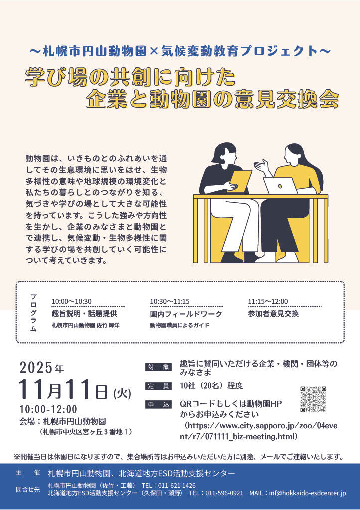 【募集中】~札幌市円山動物園×気候変動教育プロジェクト~「学びの場の共創に向けた企業と動物園の意見交換会」(札幌 11/11)