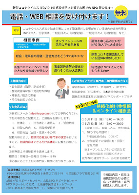 NPOサポートセンターでは新型コロナウイルス(COVID-19)感染症防止対策でお困りのNPO等向け「電話・WEB相談窓口」を開設しています
