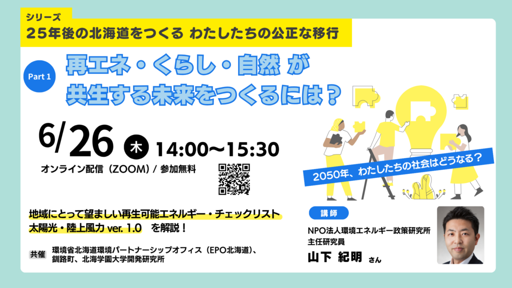 EPO北海道では、昨年度までも気候変動対策と自然再興の調和をテーマにオンライン勉強会を開催してきましたが、2025年度は、25年後にせまる2050年へ向けた公正な移行という観点を加えたシリーズ企画を実施します。